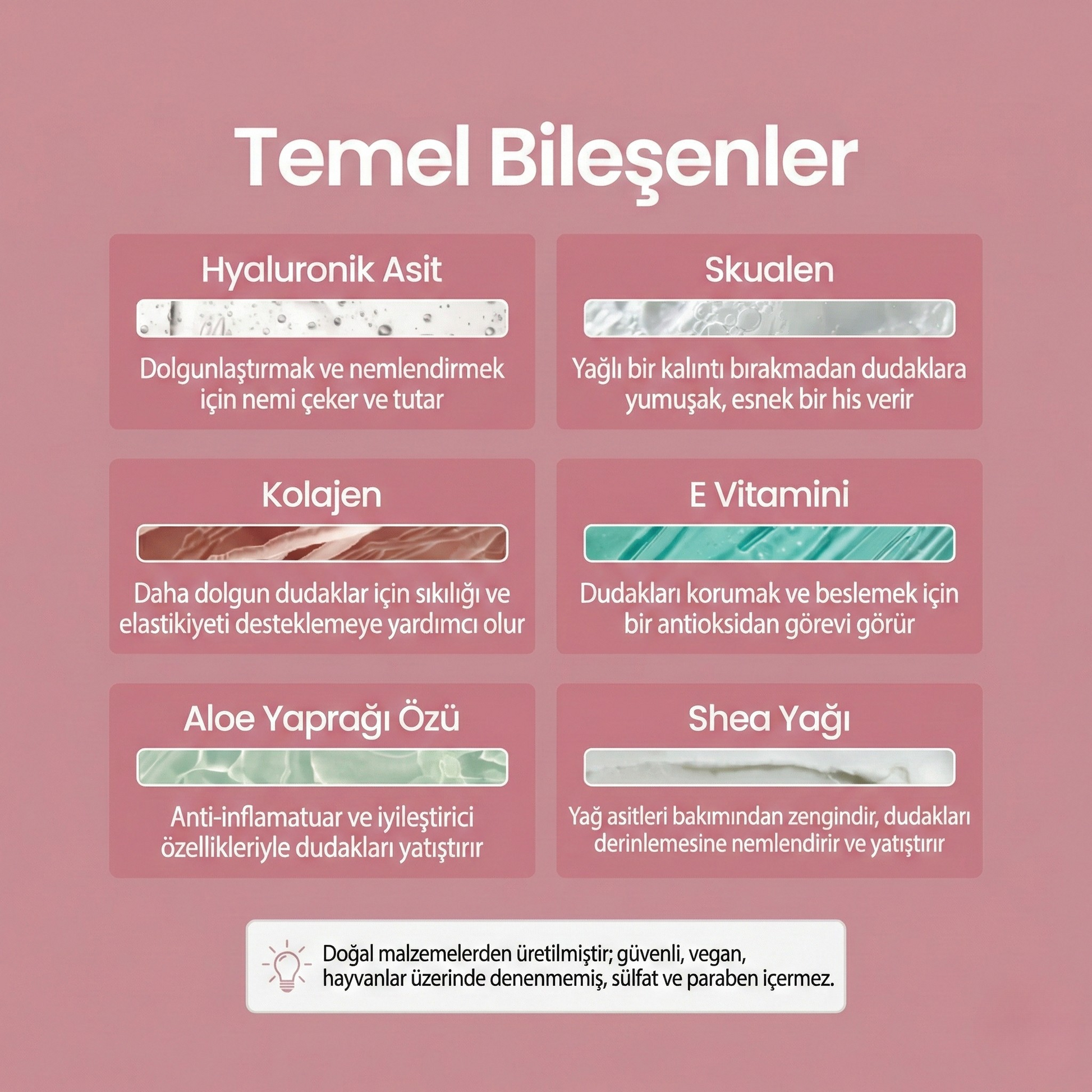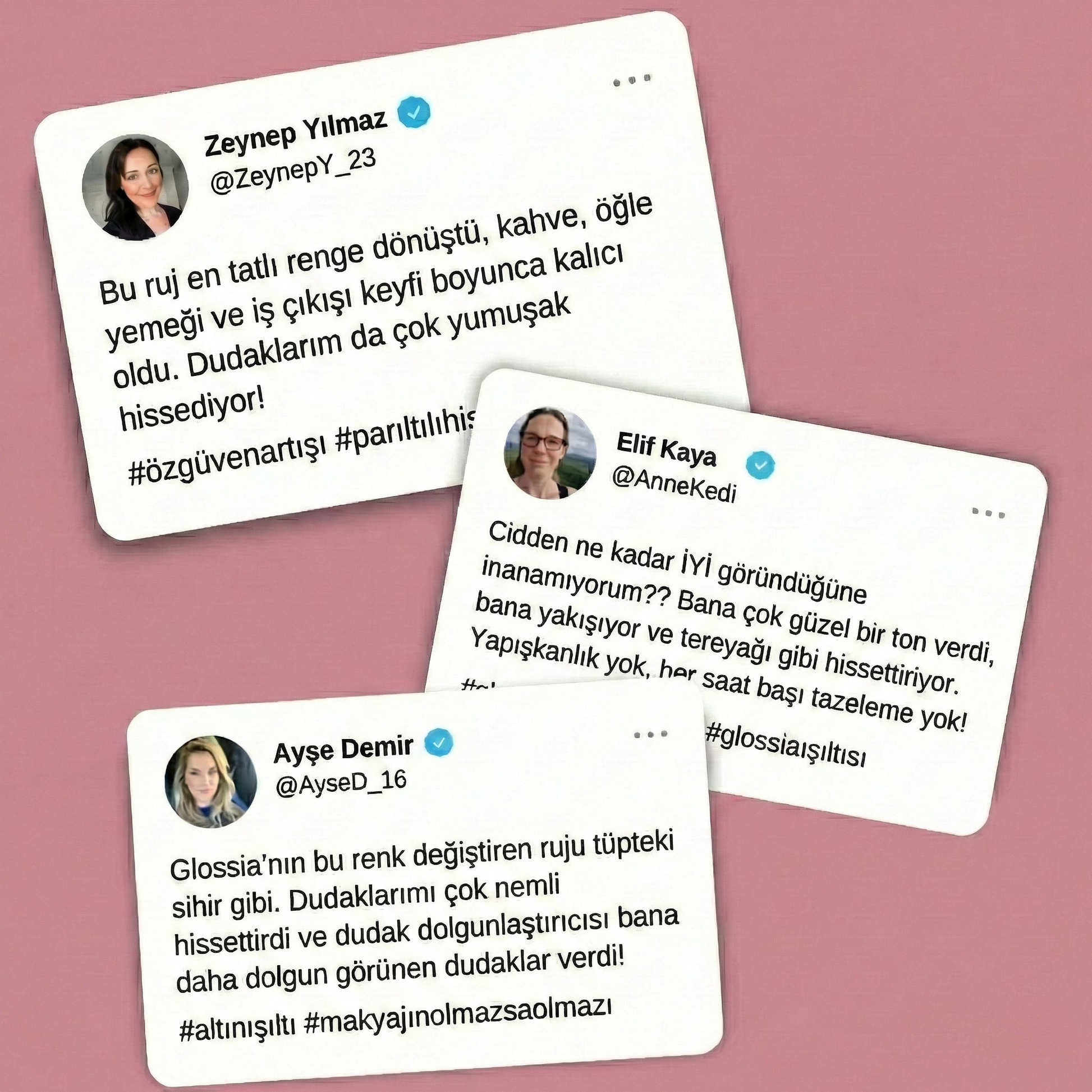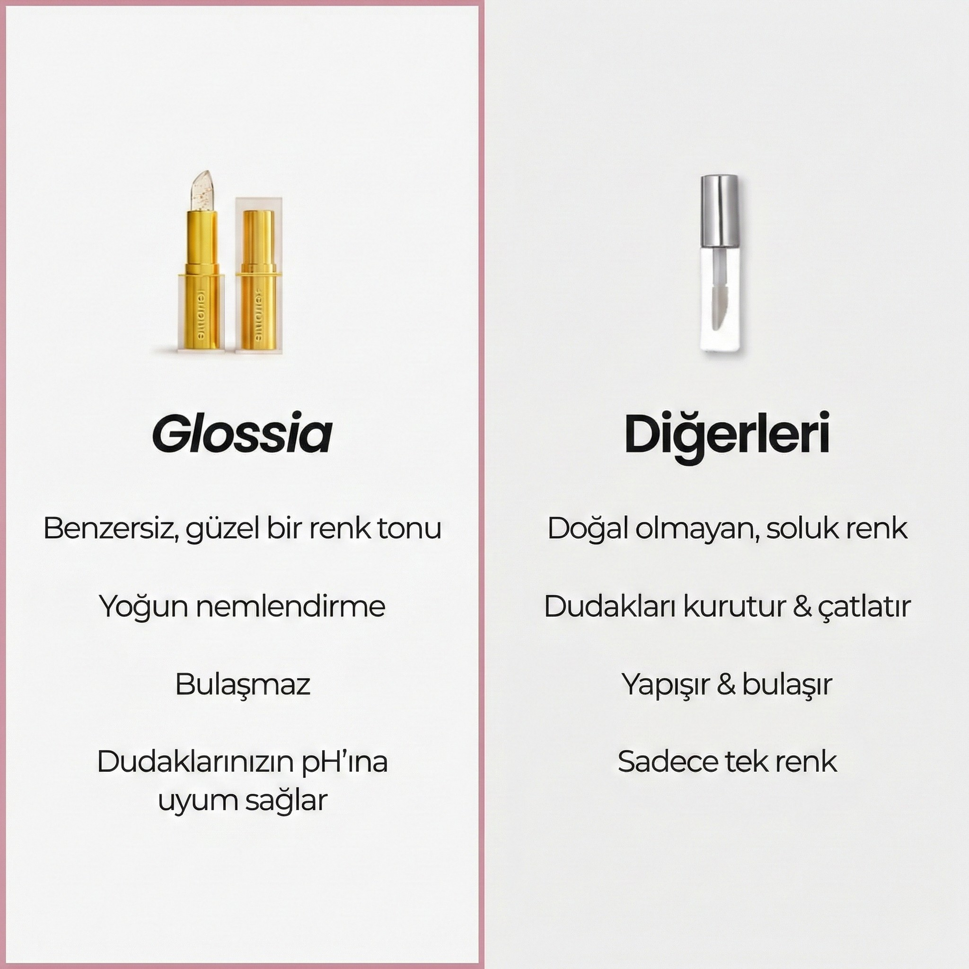 Glossia rujumuz size sadece uzun süre kalıcı renk vermekle kalmaz, aynı zamanda dudaklarınızın sağlıklı ve nemli kalmasını sağlar. Altın varank gibi besleyici içeriklerle güzelliği bakımla harmanlıyoruz.